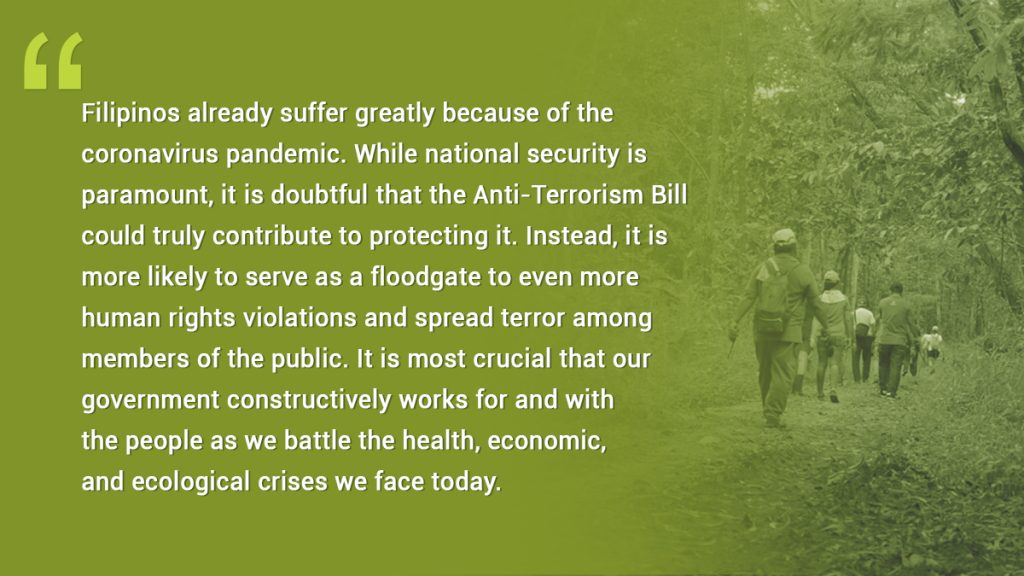 Filipinos already suffer greatly because of the coronavirus pandemic. While national security is paramount, it is doubtful that the Anti-Terrorism Bill could truly contribute to protecting it. Instead, it is more likely to serve as a floodgate to even more human rights violations and spread terror among members of the public. It is most crucial that our government constructively works for and with the people as we battle the health, economic, and ecological crises we face today.